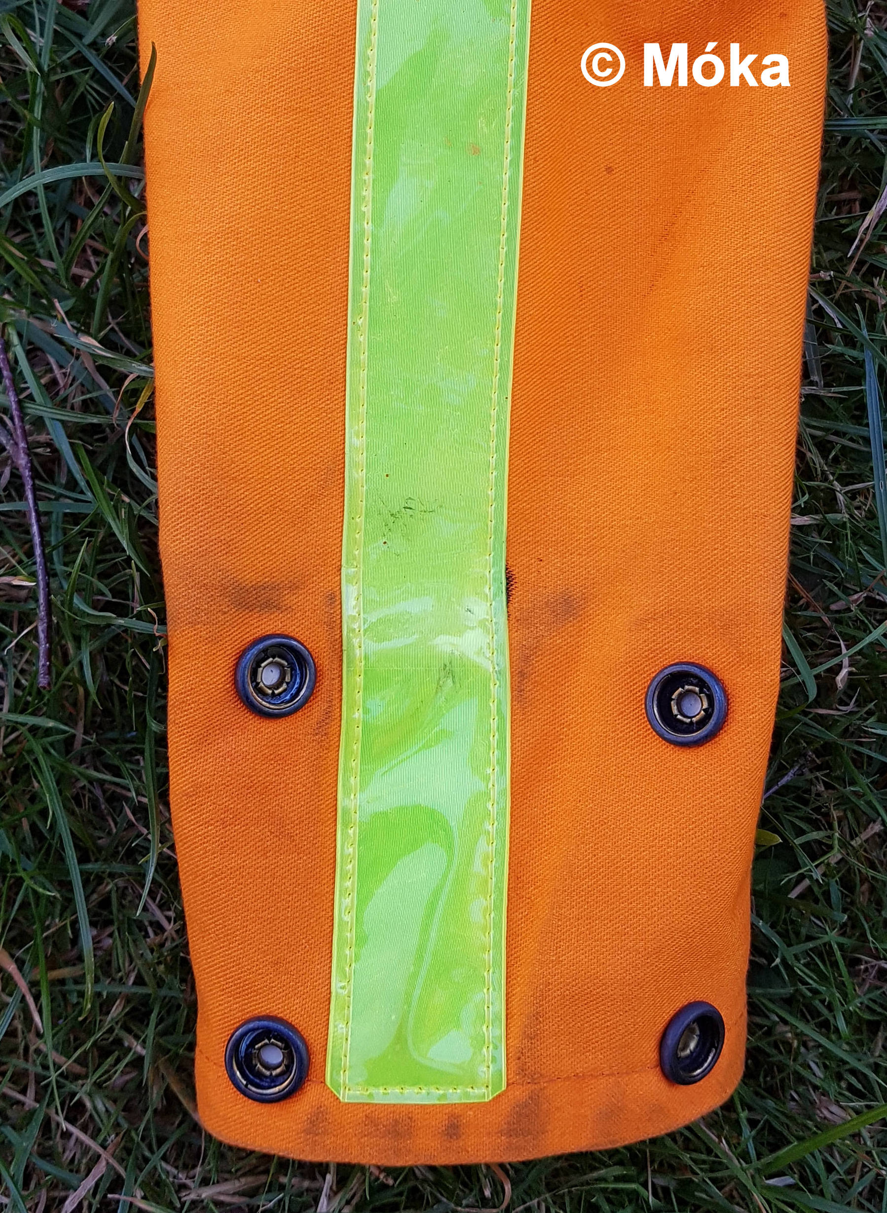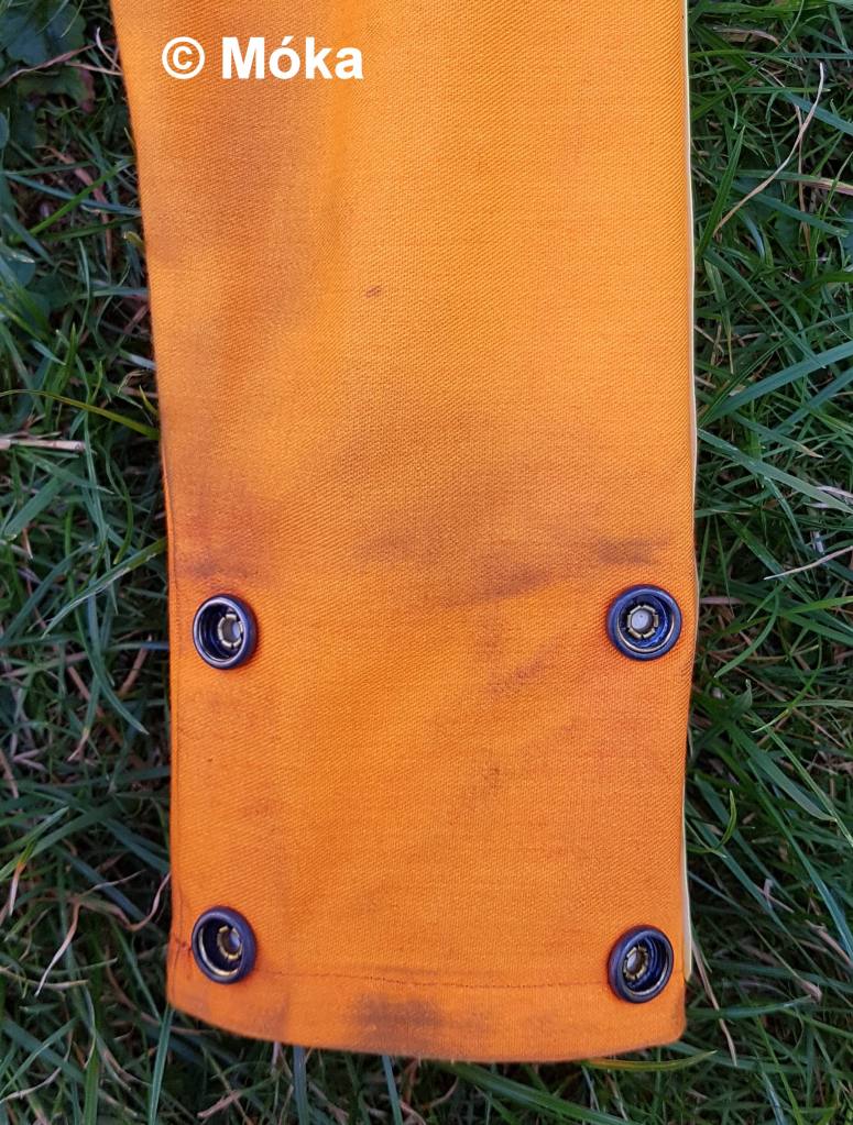 Die Gardinenösen aus Kunststoff (ich hatte in der Größe keine aus Metall gefunden) wurden mit Autolack in der Farbe kupfer umgefärbt. Nach dem Trocknen wurden am unteren Hosenbeinabschluss vor den gelben Reflektorbänder 2 Löcher geschnitten und die umgefärbten Ösen eingeklickt.