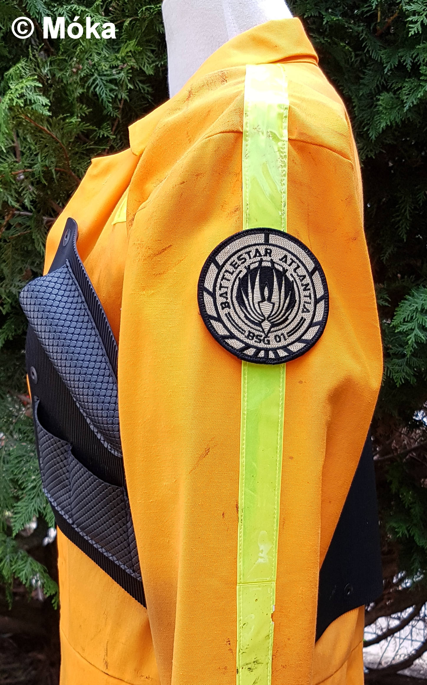 Tipp: Hinter dem Patch Klettband und auf der Stelle bei des Overalls Flauschband aufnähen. So können verschiedene Battlestar-Patches verwendet werden