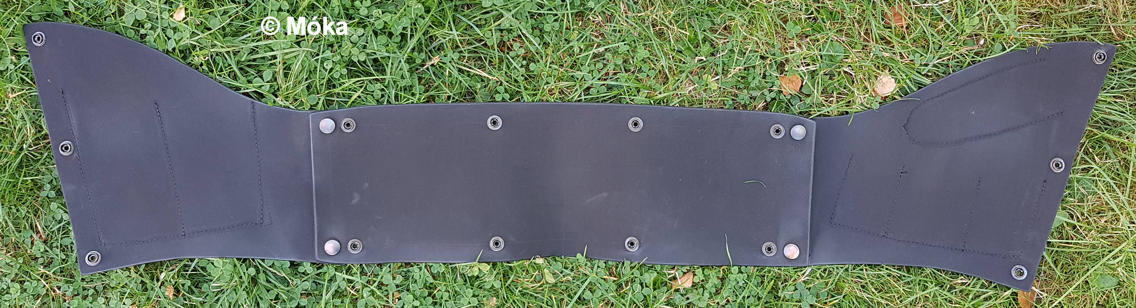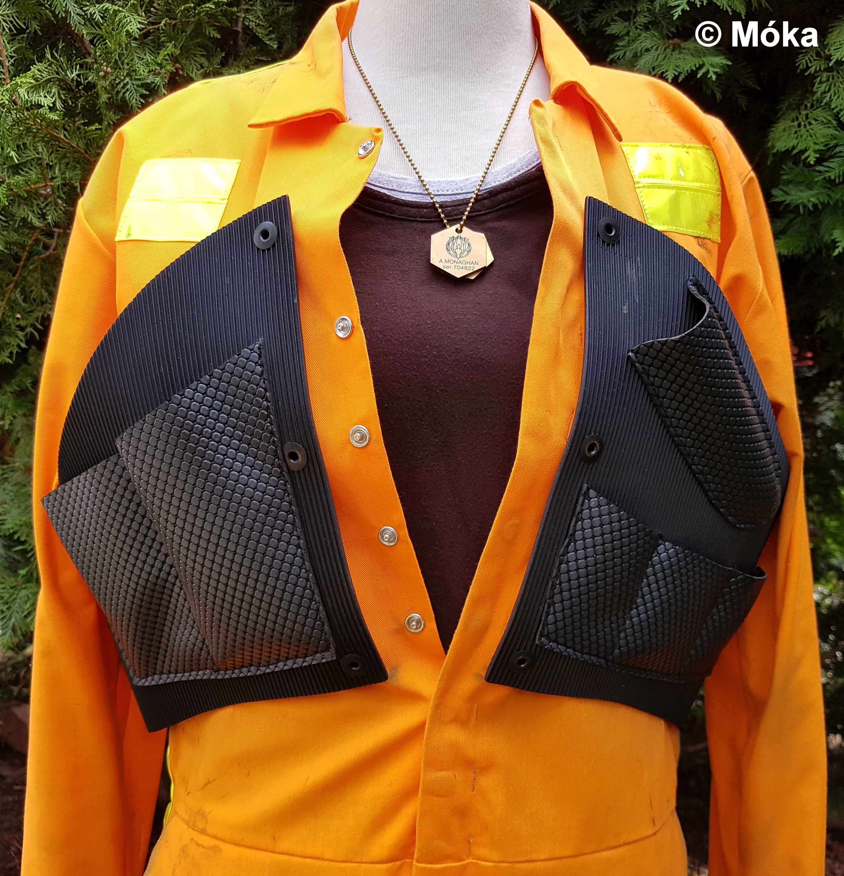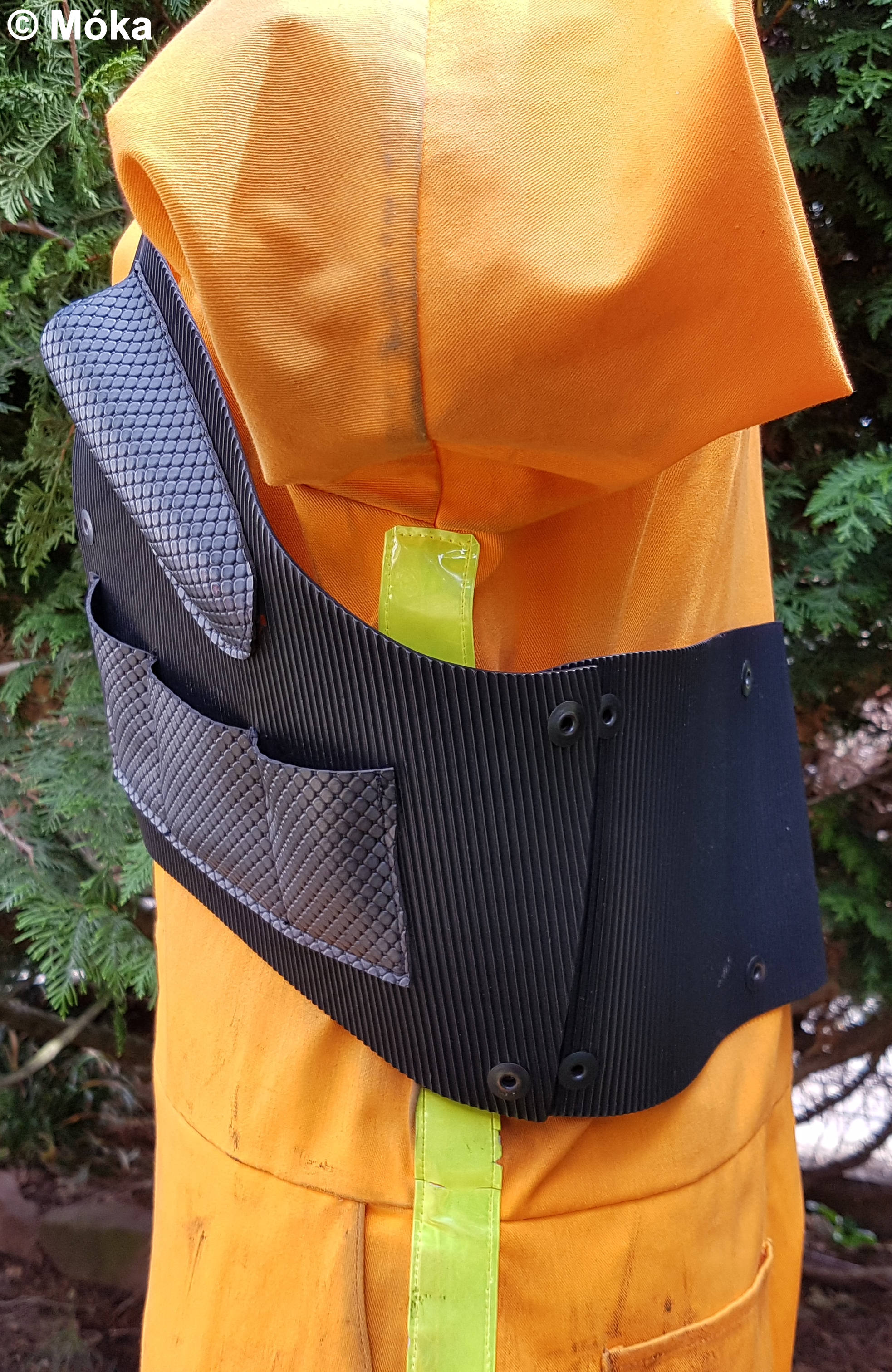 Die Weste besteht in der Basis aus 3 Teilen. Diese sind mit Druckköpfen verbunden und werden später ebenfalls mit den selben Druckknöpfen an dem Overall befestigt. Hinweis: Darauf achten, dass diese „falsch“ herum festgenietet werden, d.h. die Unterseite ist sichtbar und der eigentliche Kopf des Druckknopfs nicht.