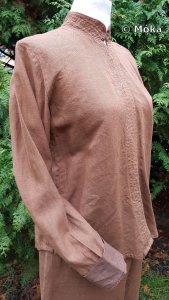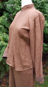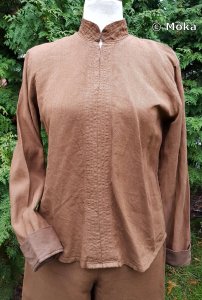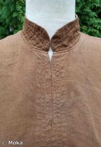 Das Hemd hat einen Stehkragen von 4 cm und wird vorne mit Haken und Augen geschlossen.
