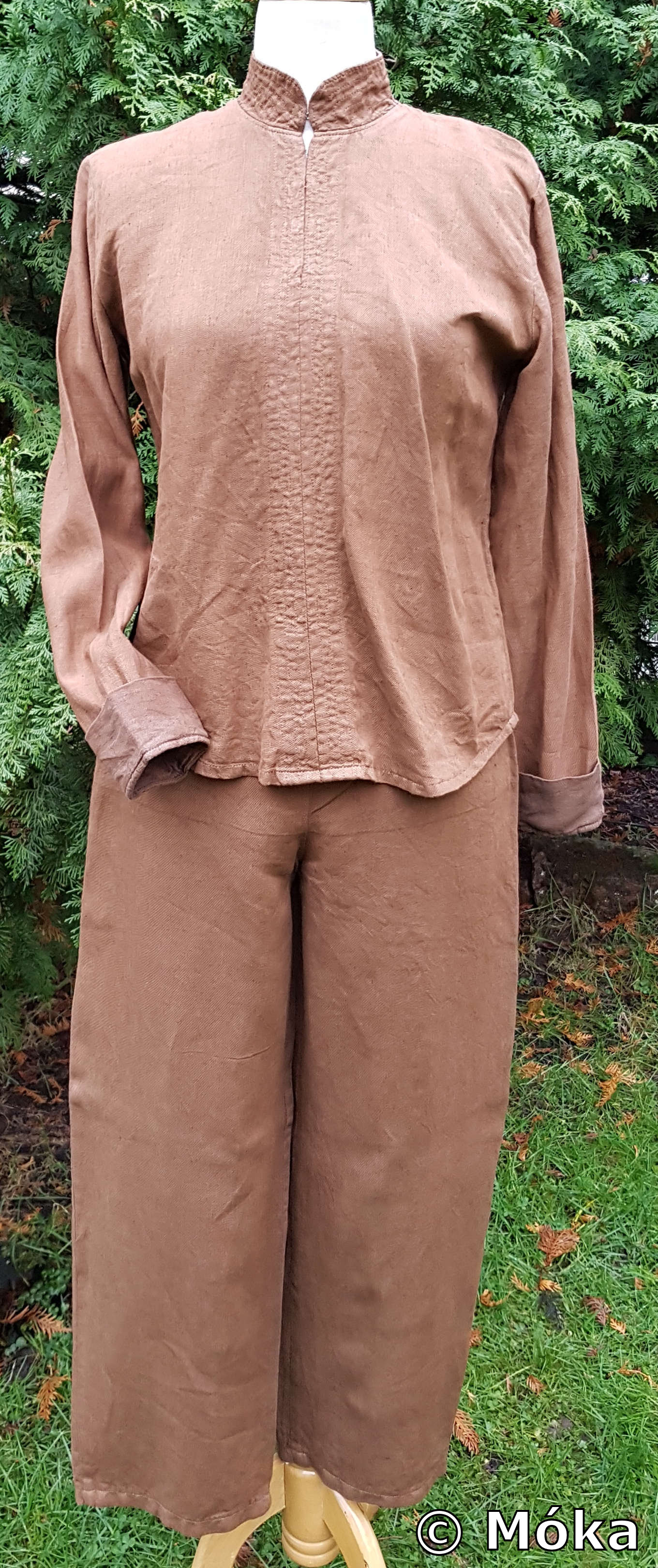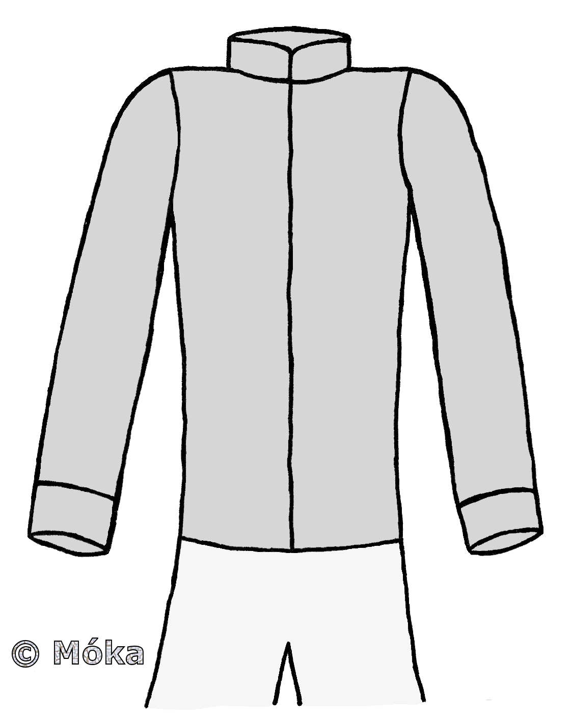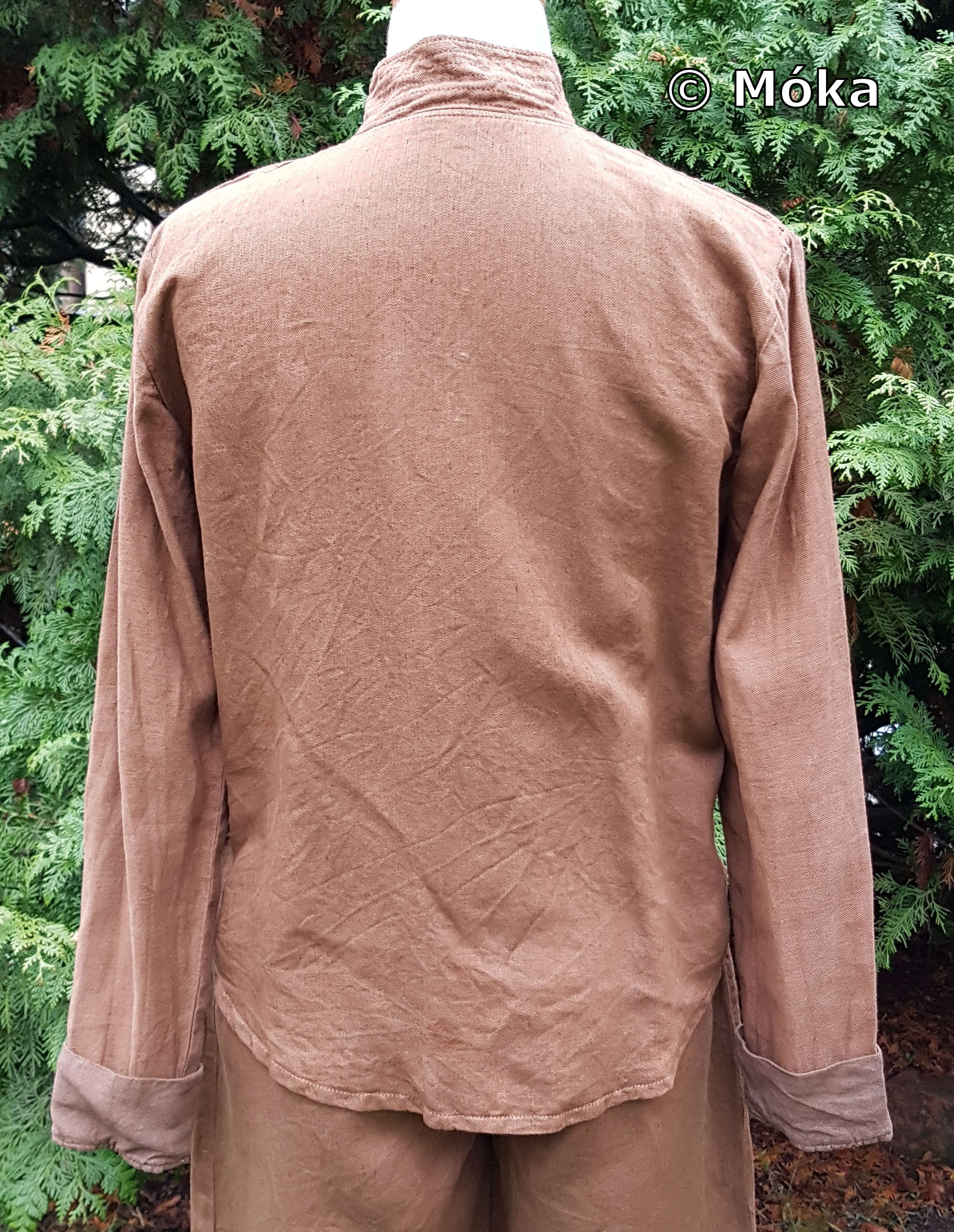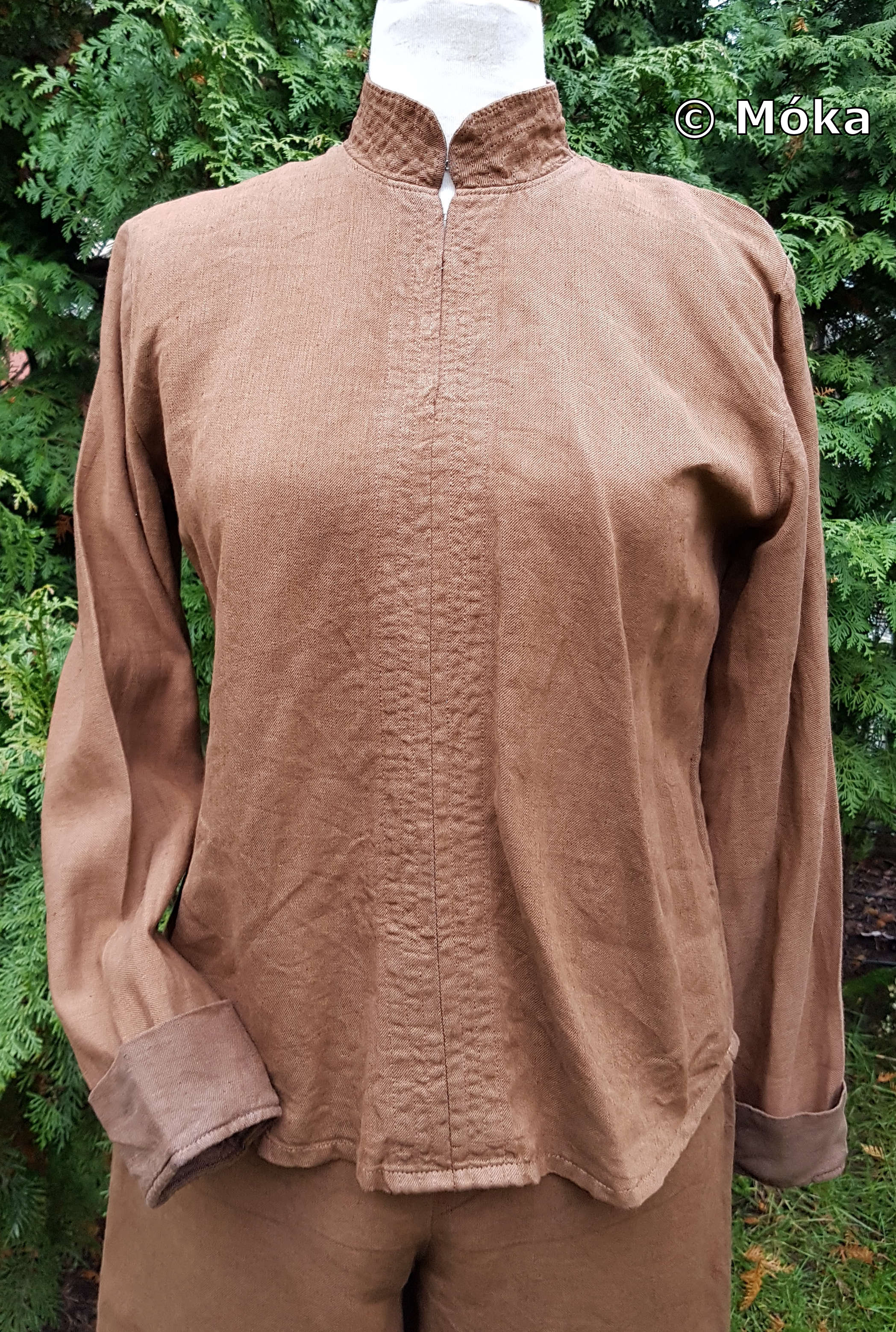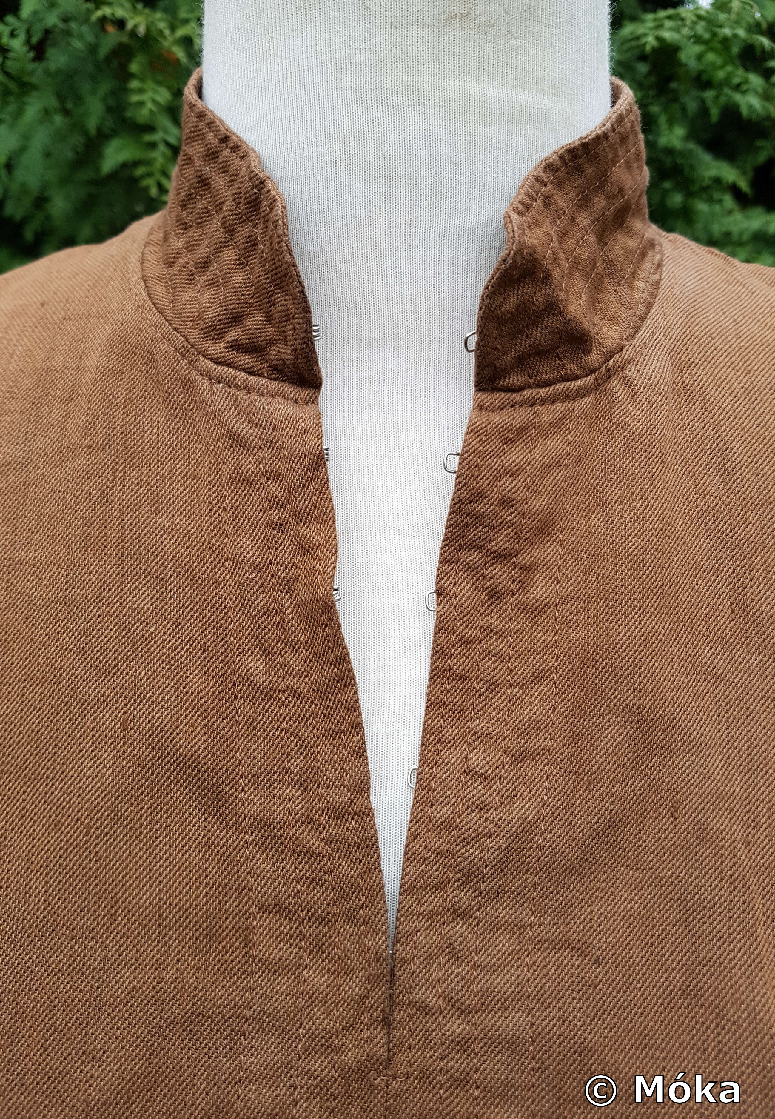 Das Hemd hat einen Stehkragen von 4 cm und wird vorne mit Haken und Augen geschlossen.