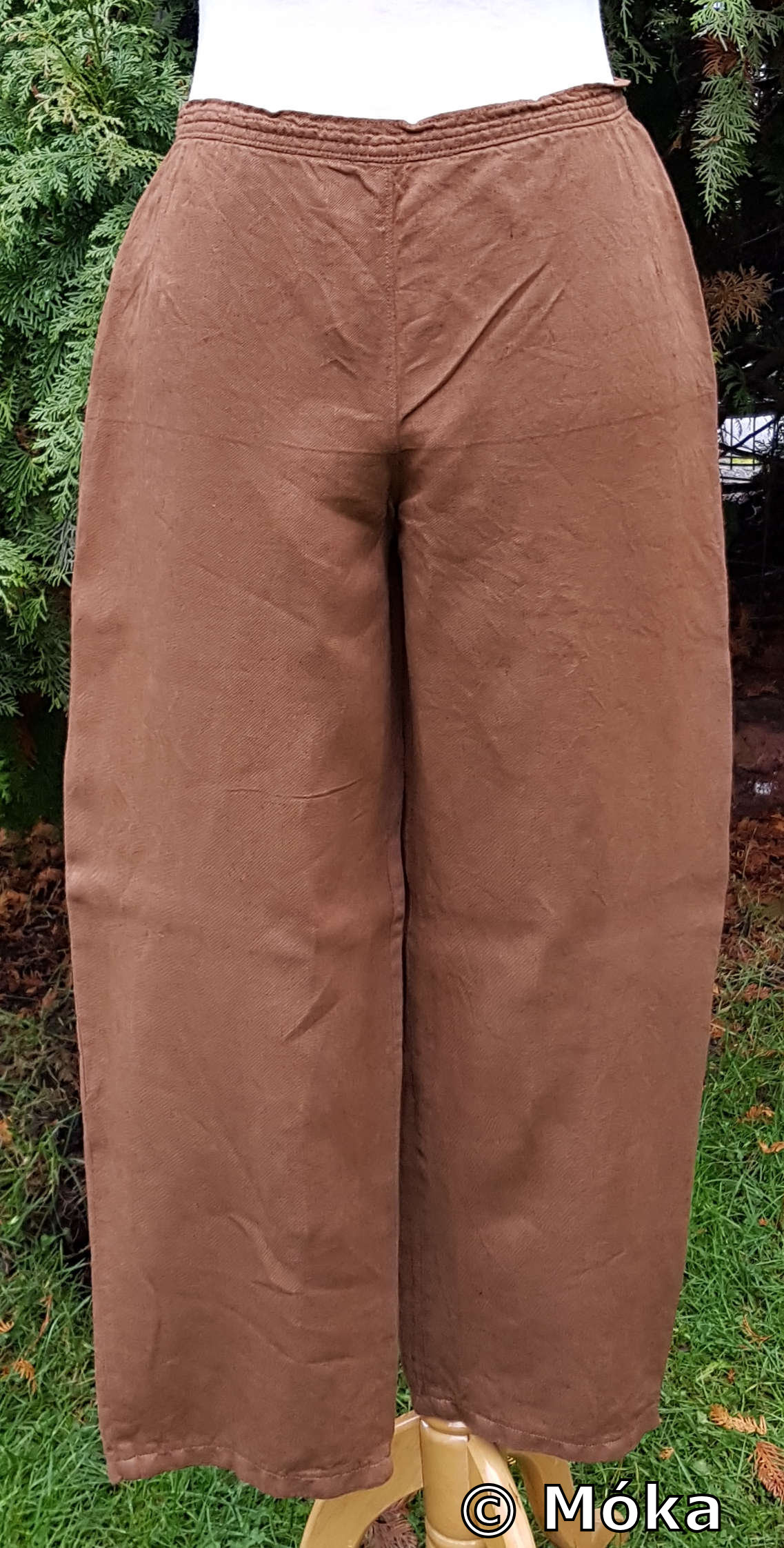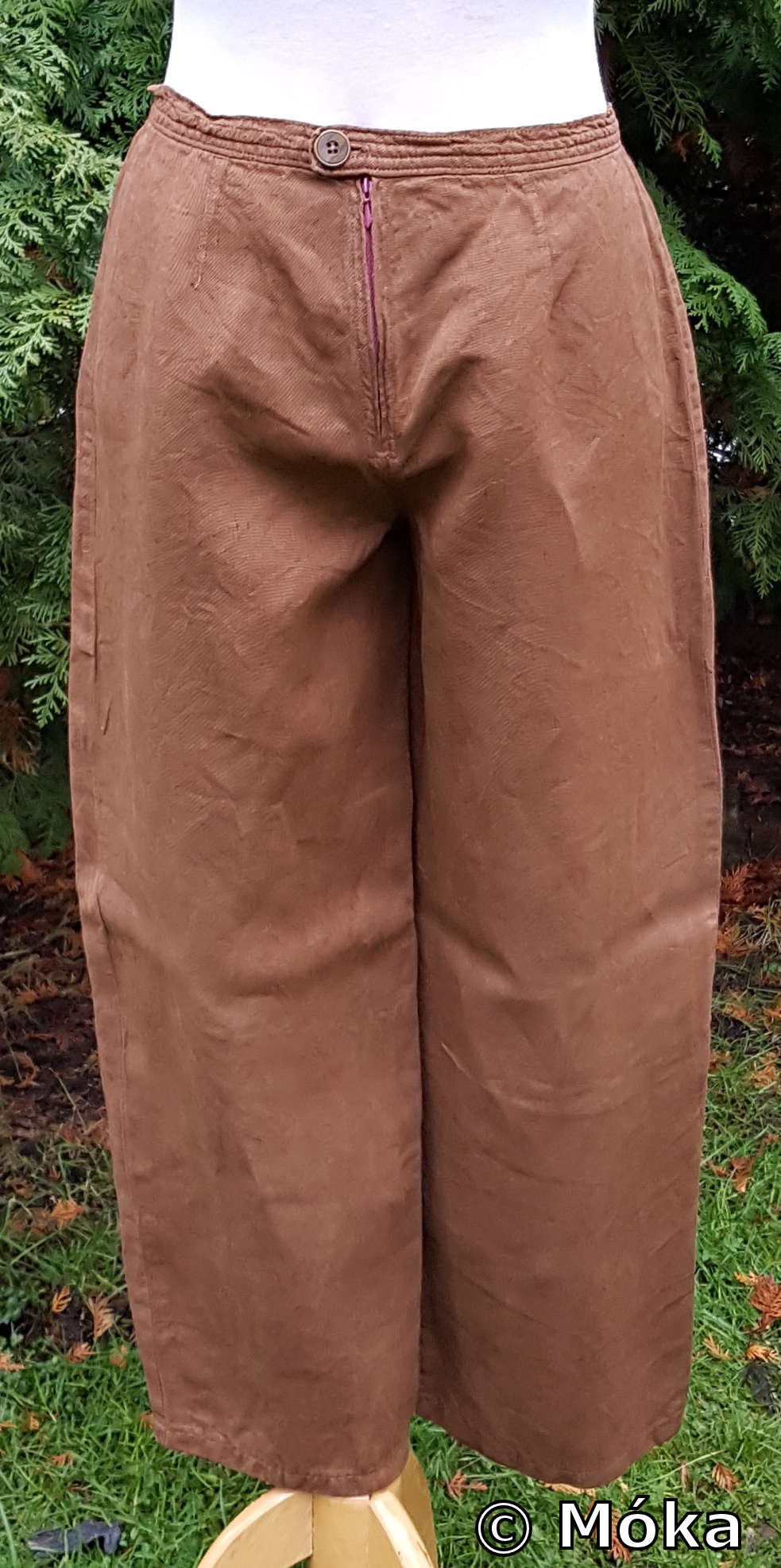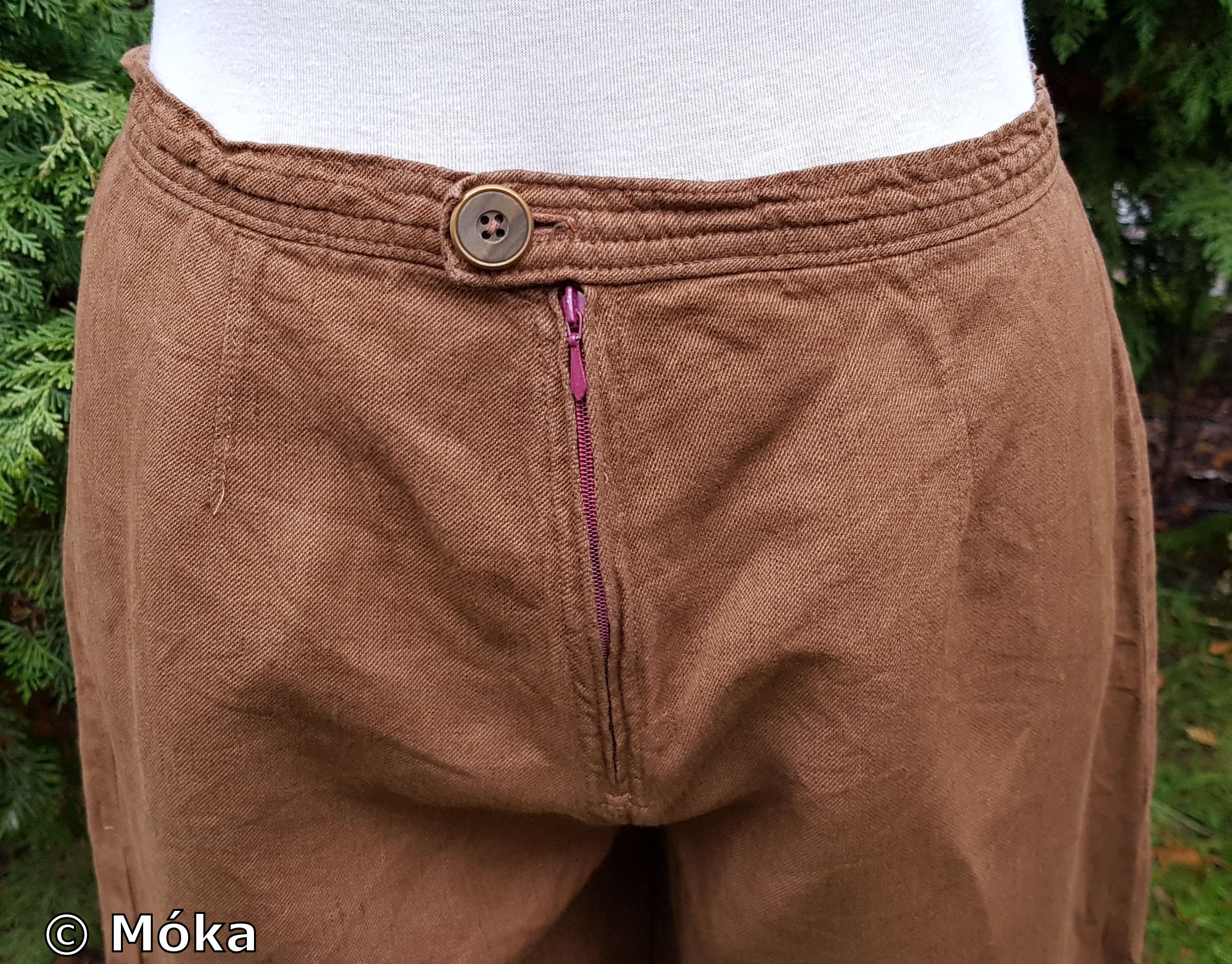 Hose Material: Meterware Stoff (Leinen, 1,5 m x 1,8 m; in braun eingefärbt)Reißverschluss (1 Stück)Knopf (1 Stück) Das Schnittmuster ist ein einfacher Hosenschnitt mit weiten Beinen. Die Hose wird hinten mit einem Reißverschluss und einem Kopf geschlossen.