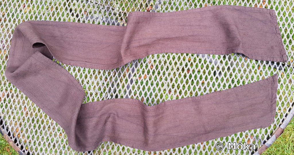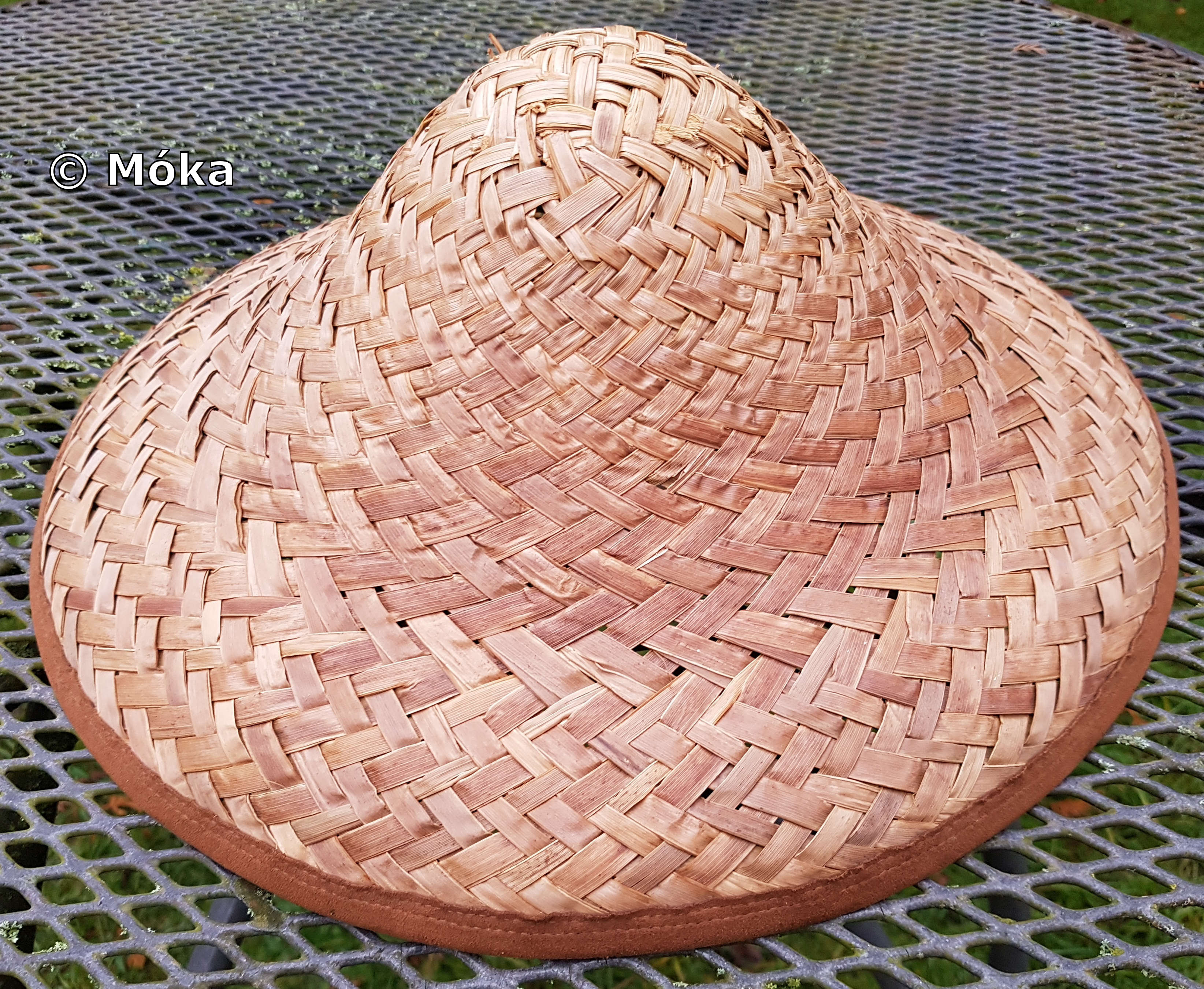 Hut und Gürtel Bei einem gekauften asiatischen Strohhut habe ich um den Rand Velourleder genäht. Aus dem Leinen (Reststück Übergewand und in braun eingefärbt) habe ich einen Gürtel mit den Maßen 13 cm x 1,9 m genäht.