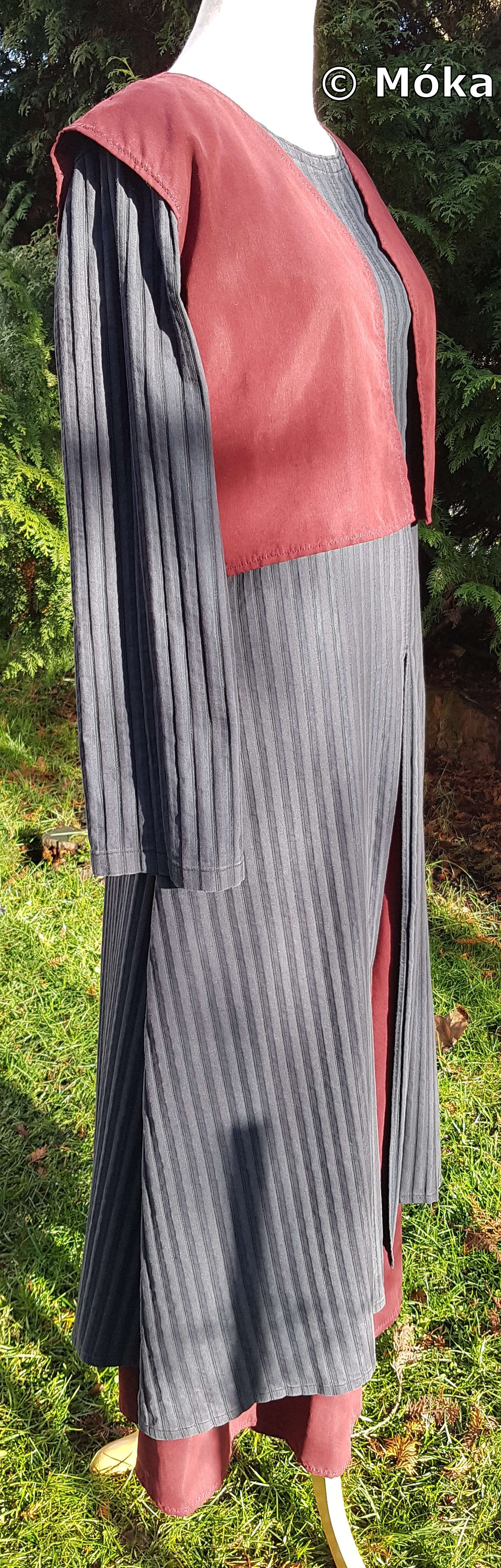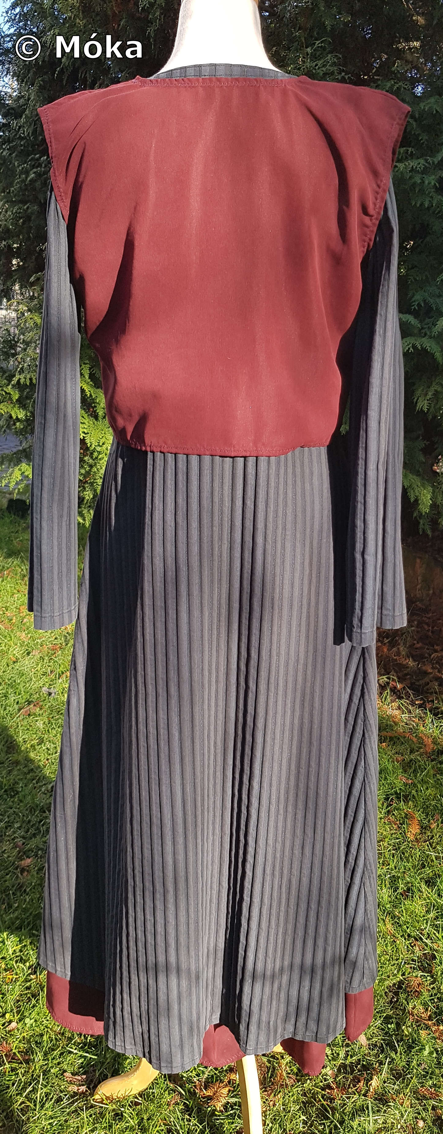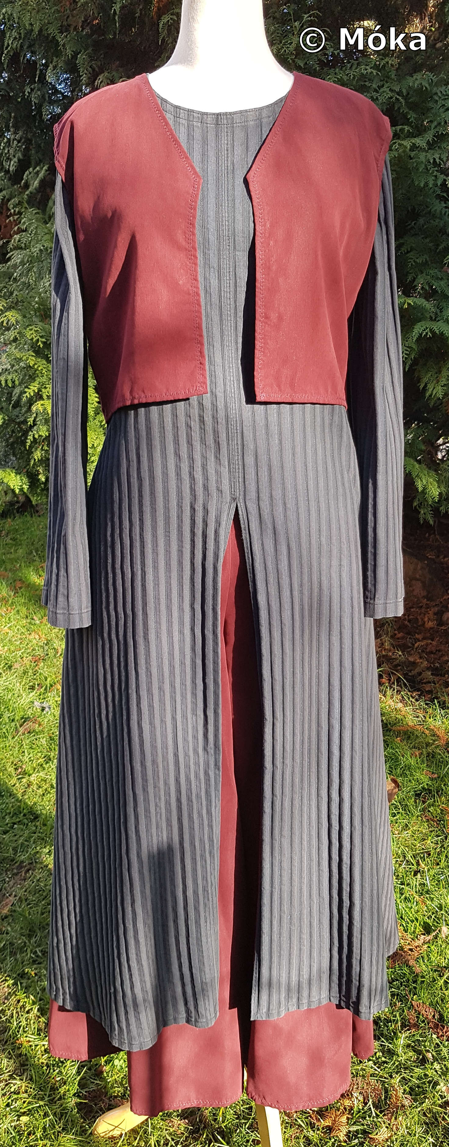 Weste Material: Meterware Stoff (Farbe bordeaux, dünner Stoffmix <- selber Stoff wie Hosenrock) Das Schnittmuster ist eine einfache Weste. Ich habe als Basis dafür das Schnittmuster des Übergewandes verwendet und angeasst.