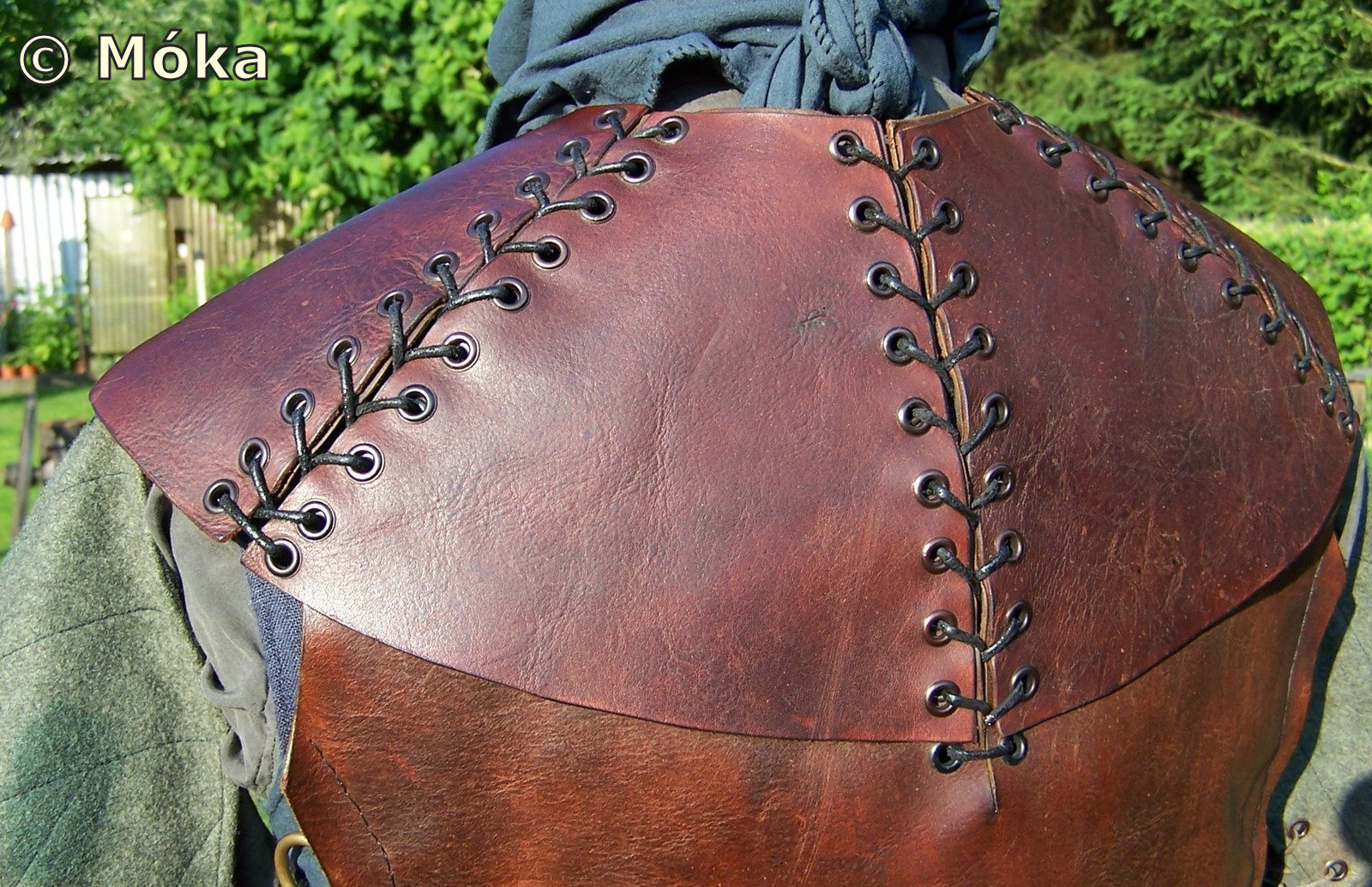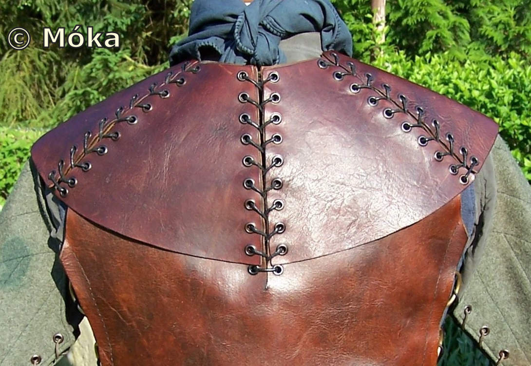 Im Original besteht der Kragen aus einem Stück und liegt lose auf der Rüstung auf. Bei mir sind es mehrere Teile. Diese werden mit der Lederrüstung zusammen verschnürt.
