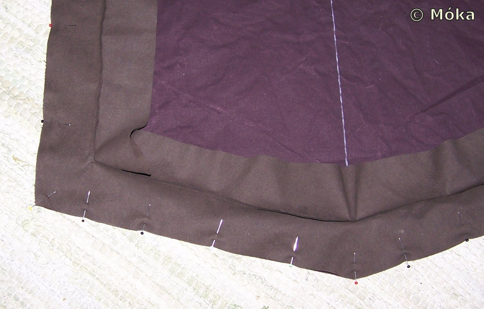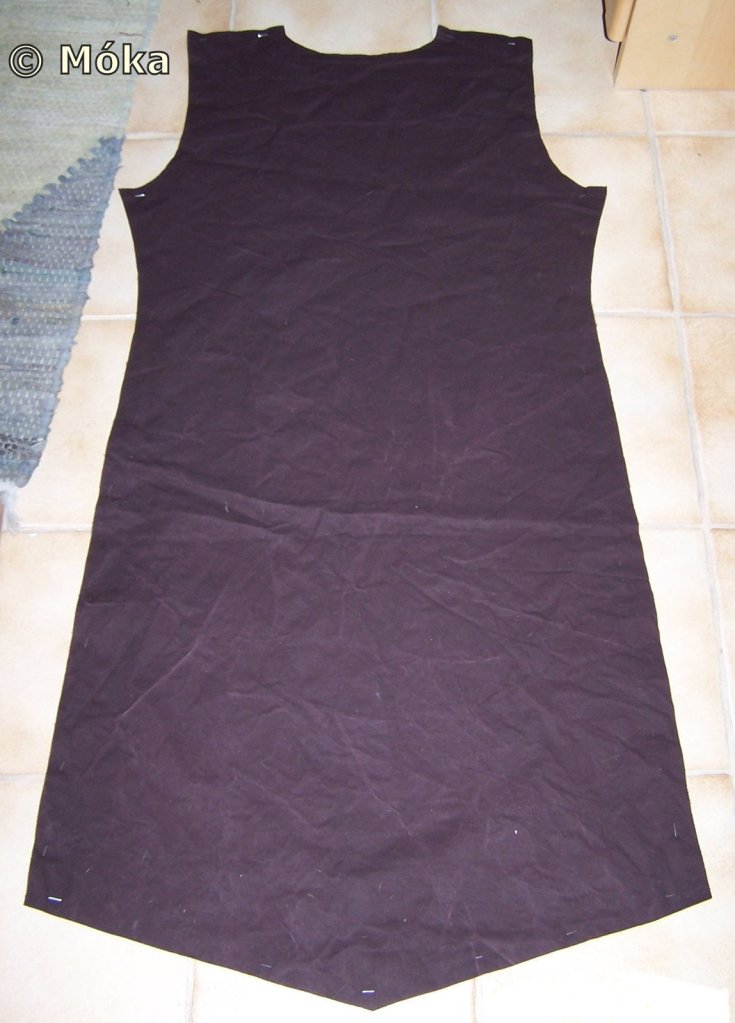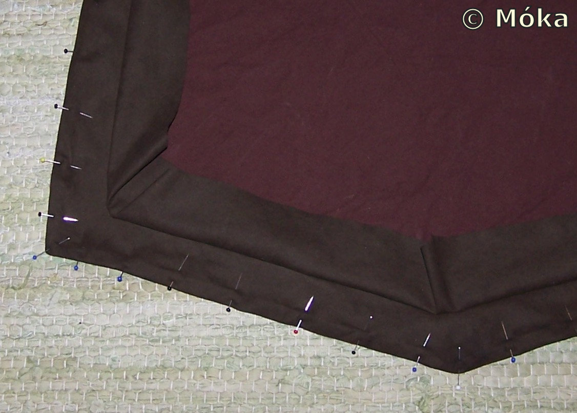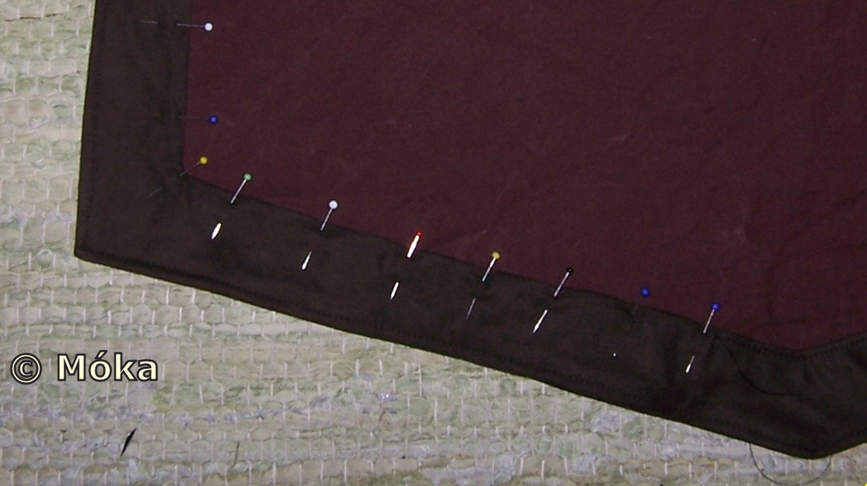 Das Vernähte auf die vordere Seite des Wappenrockes umklappen (verstürzen), mit Nadeln zusammenstecken und eine Naht darauf setzen.