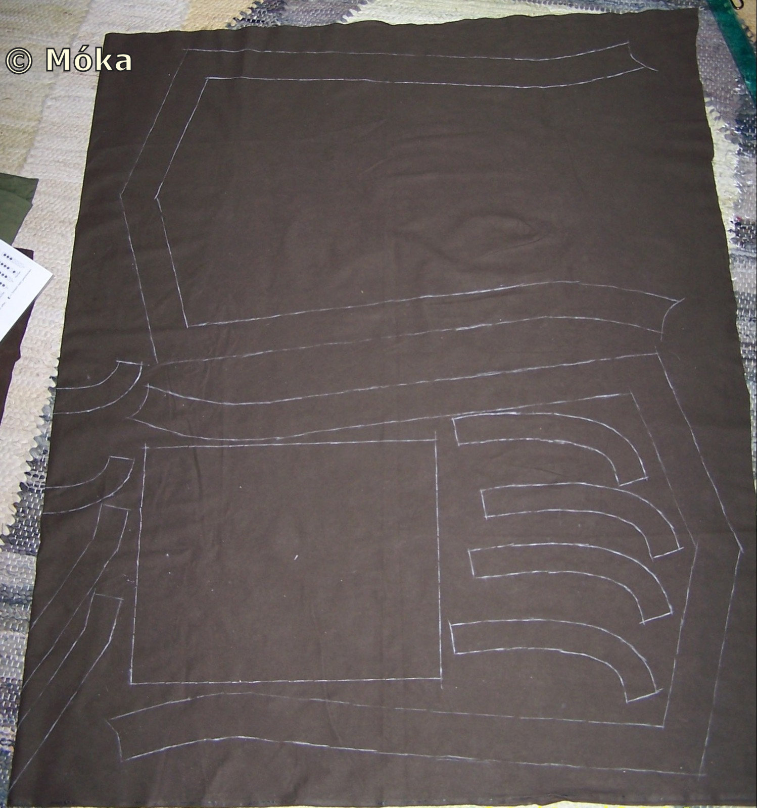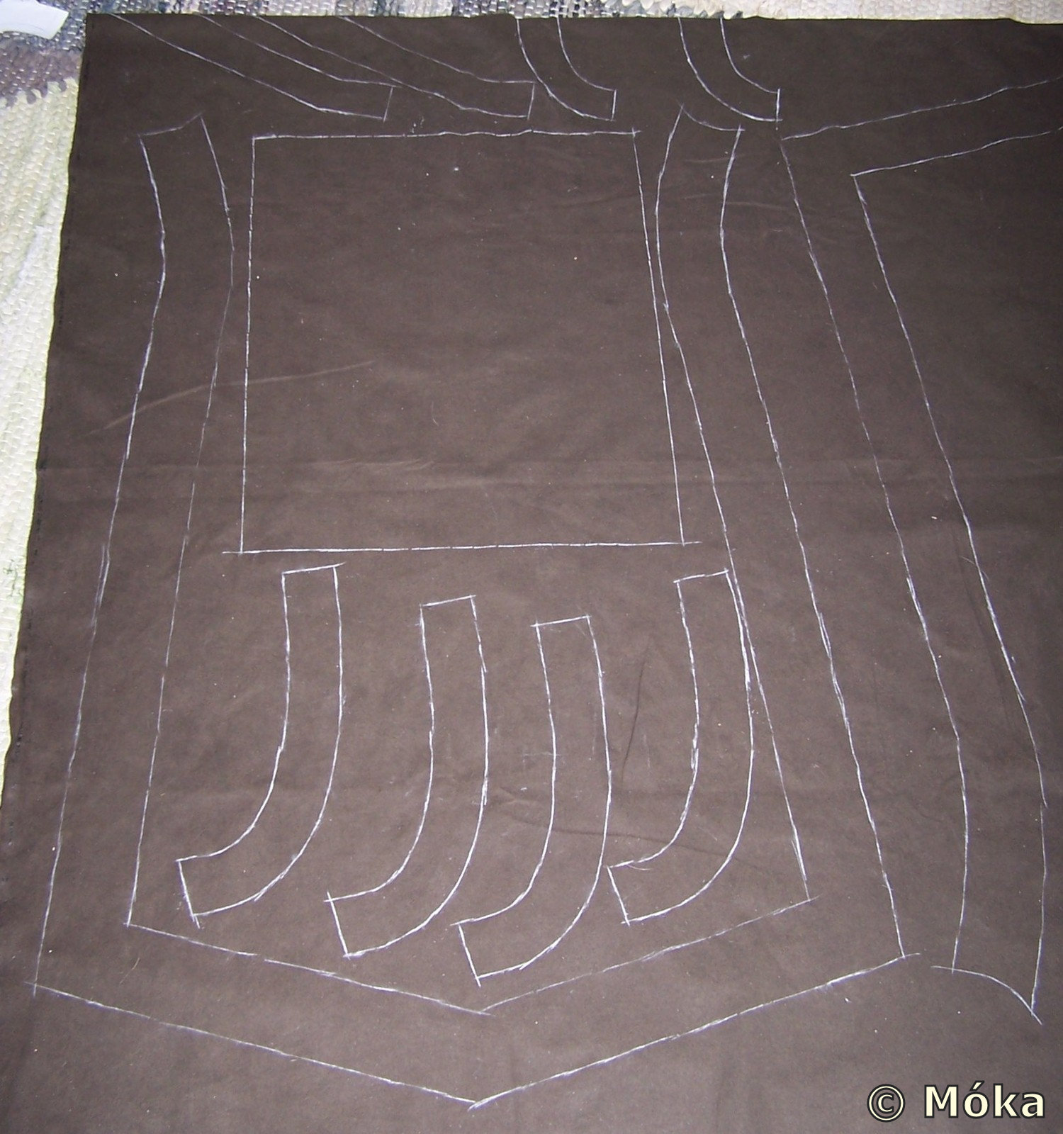 Anschließend eine Stofflage des Velours mit dem Wappenrock vernähen. Hier darauf achten dass die hintere Seite des Wappenrockes mit der vorderen Seite des Velours vernäht wird.