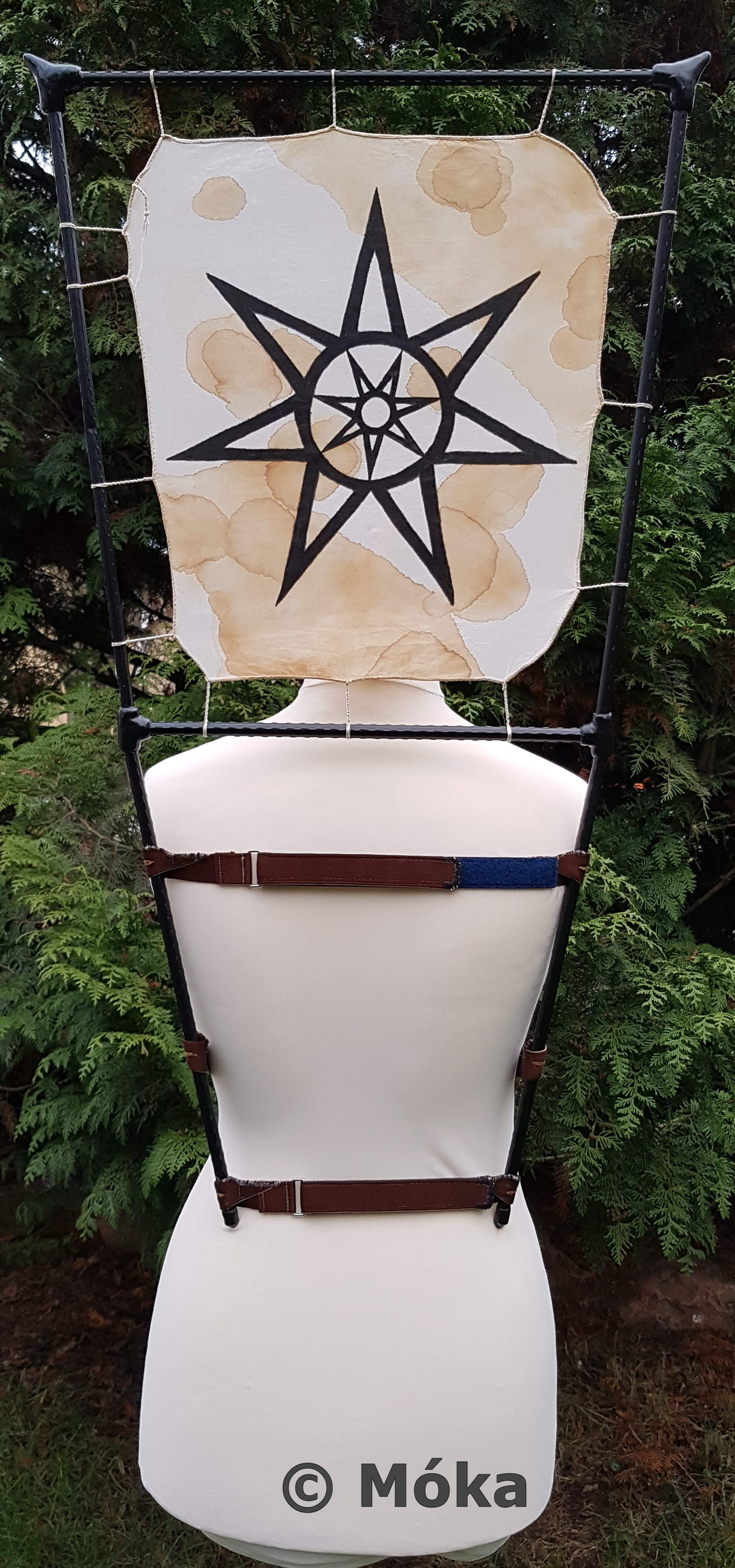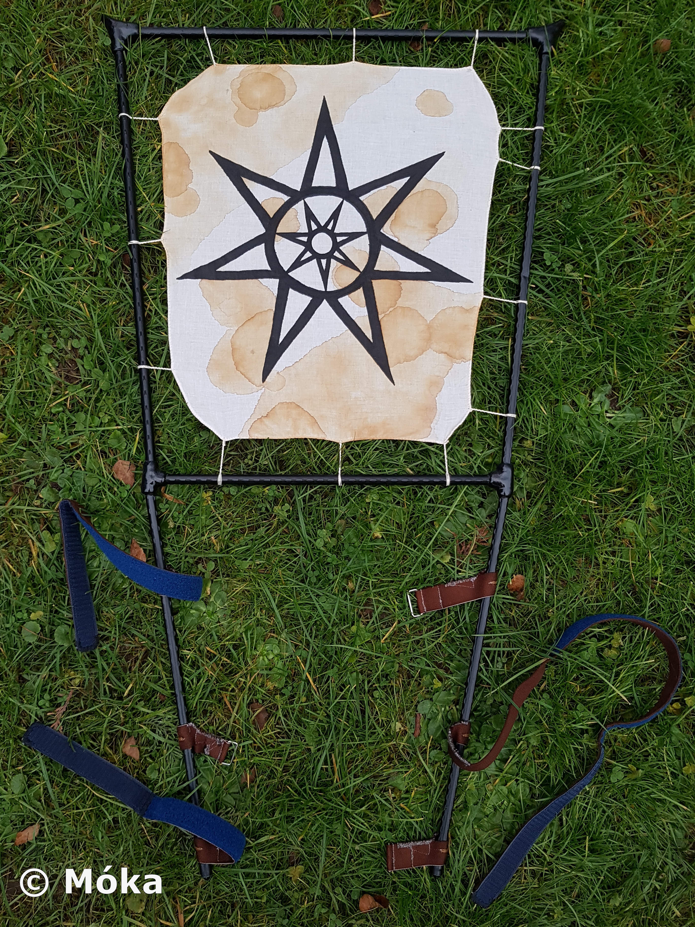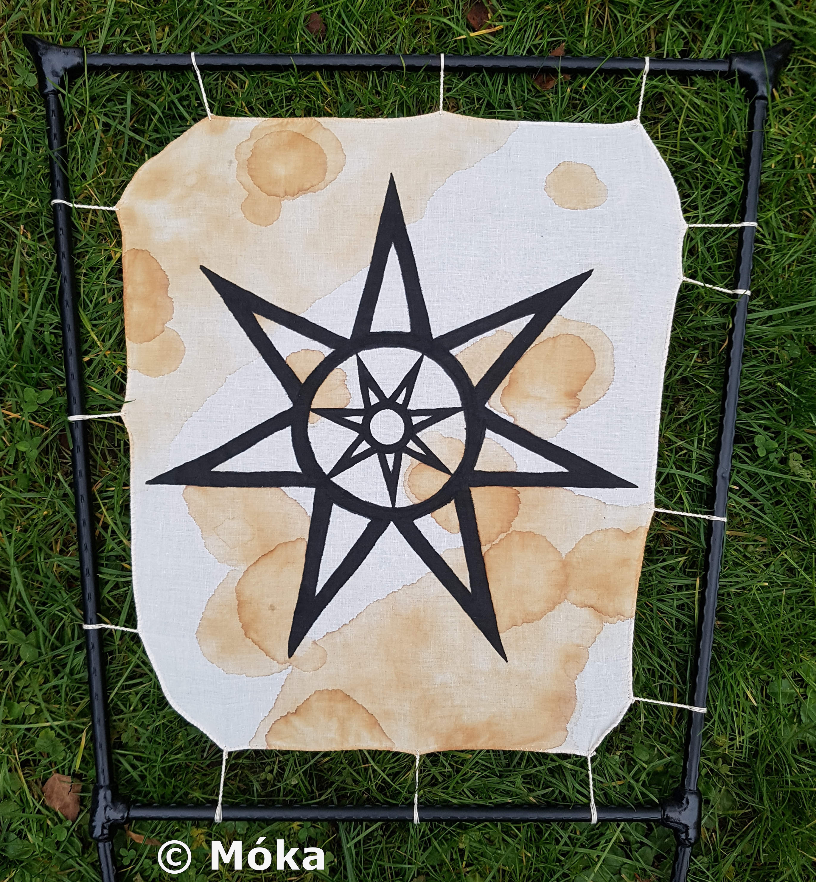 Für die Fahne habe ein Reststück dünnen, weißen Stoffs verwendet. Der Stoff wurde zurechtgeschnitten, der Rand von Hand umsäumt und danach mit schwarzem Tee eingefärbt. Nach dem Trocken und Bügeln wurde der Siebenzackige Stern mit schwarzer Stofffarbe aufgemalt und die Farbe nach Herstellerangaben fixiert. Anschließend wurde die Fahne mit mehreren Garnsträngen in dem Rahmen befestigt.