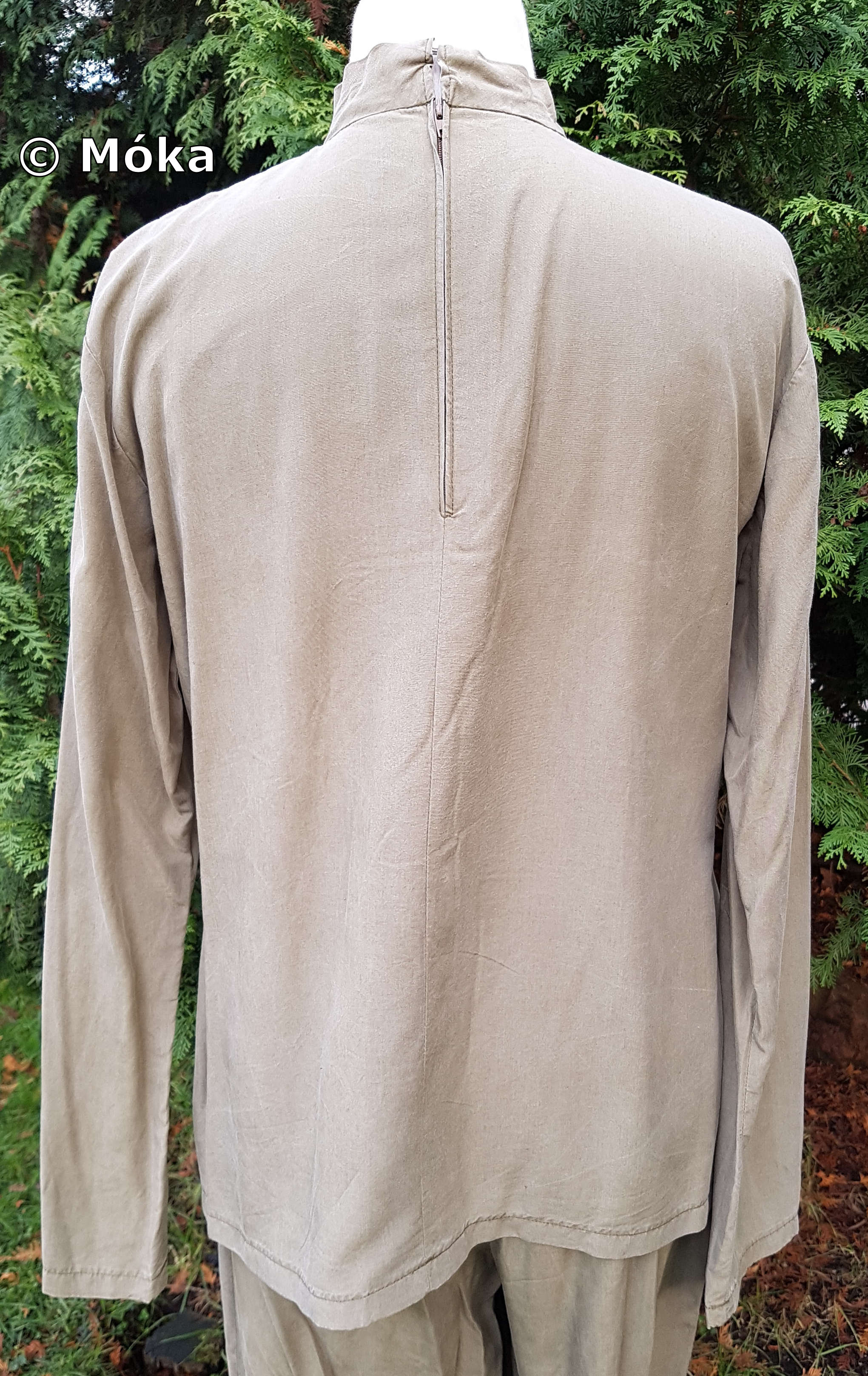 Das Hemd wird im Rücken mit einem Reißverschluss und der Kragen mit Haken und Augen verschlossen.
