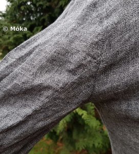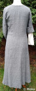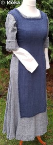 Das Schnittmuster ist jeweils ein einfaches Schlupfkleid. Das Untergewand wurde aus Bomull von Ikea genäht. Das Übergewand besteht aus dünnem Leinen. Beim Übergewand habe ich die Ärmel länger gefertigt. Diese werden umgeschlagen. Die Ärmelnäht verläuft hinten. Der blaue Überwurf besteht aus Leinen und wird an der Seite geschnürt. Die sichtbaren Nähten am Überwurf wurden von Hand mit dickem Baumwollfaden nachgenäht.