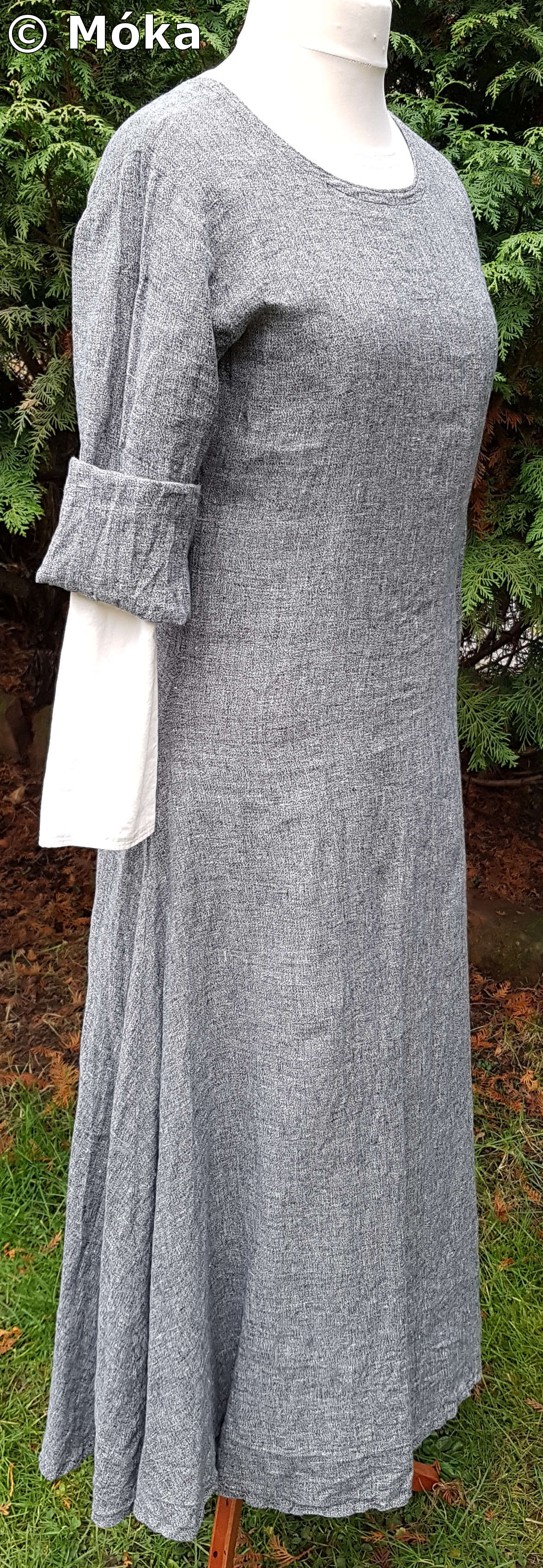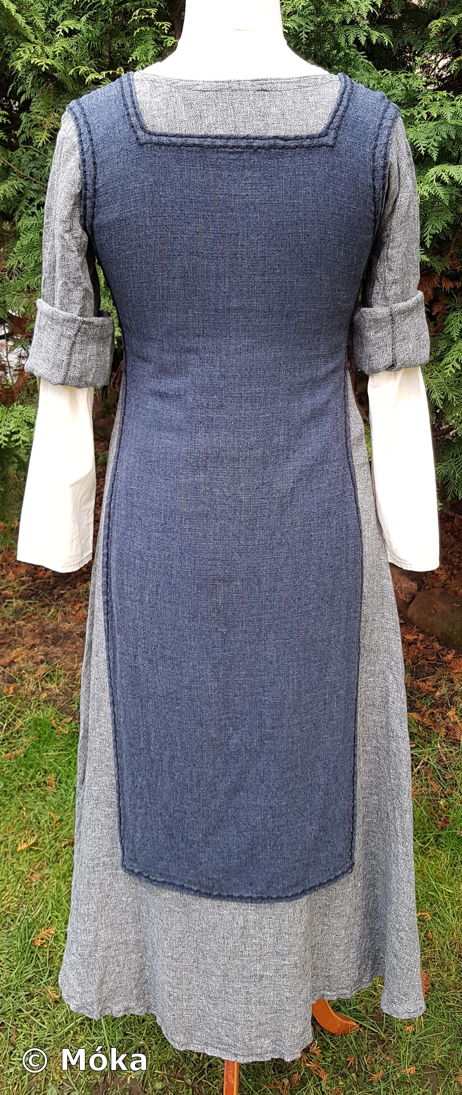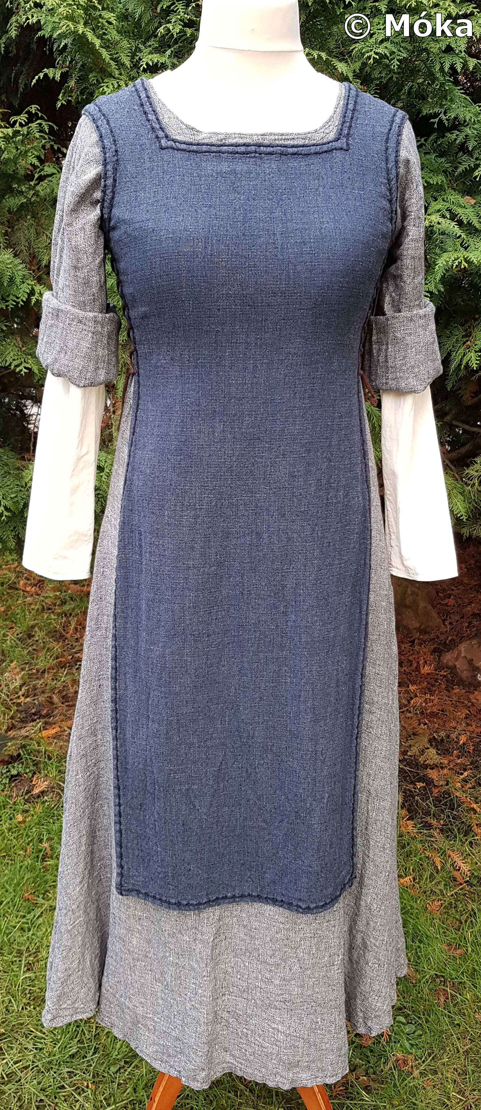 Das Schnittmuster ist jeweils ein einfaches Schlupfkleid. Das Untergewand wurde aus Bomull von Ikea genäht. Das Übergewand besteht aus dünnem Leinen. Beim Übergewand habe ich die Ärmel länger gefertigt. Diese werden umgeschlagen. Die Ärmelnäht verläuft hinten. Der blaue Überwurf besteht aus Leinen und wird an der Seite geschnürt. Die sichtbaren Nähten am Überwurf wurden von Hand mit dickem Baumwollfaden nachgenäht.