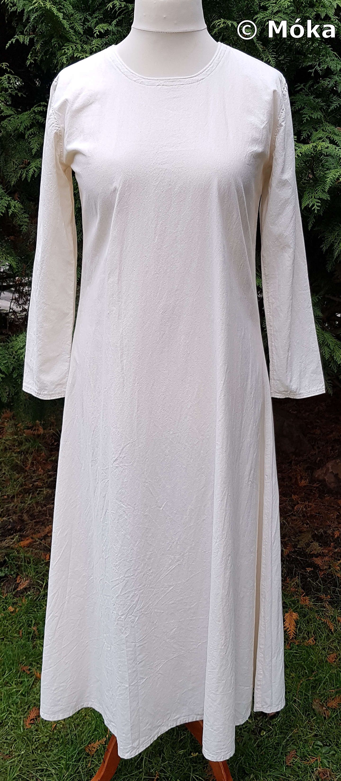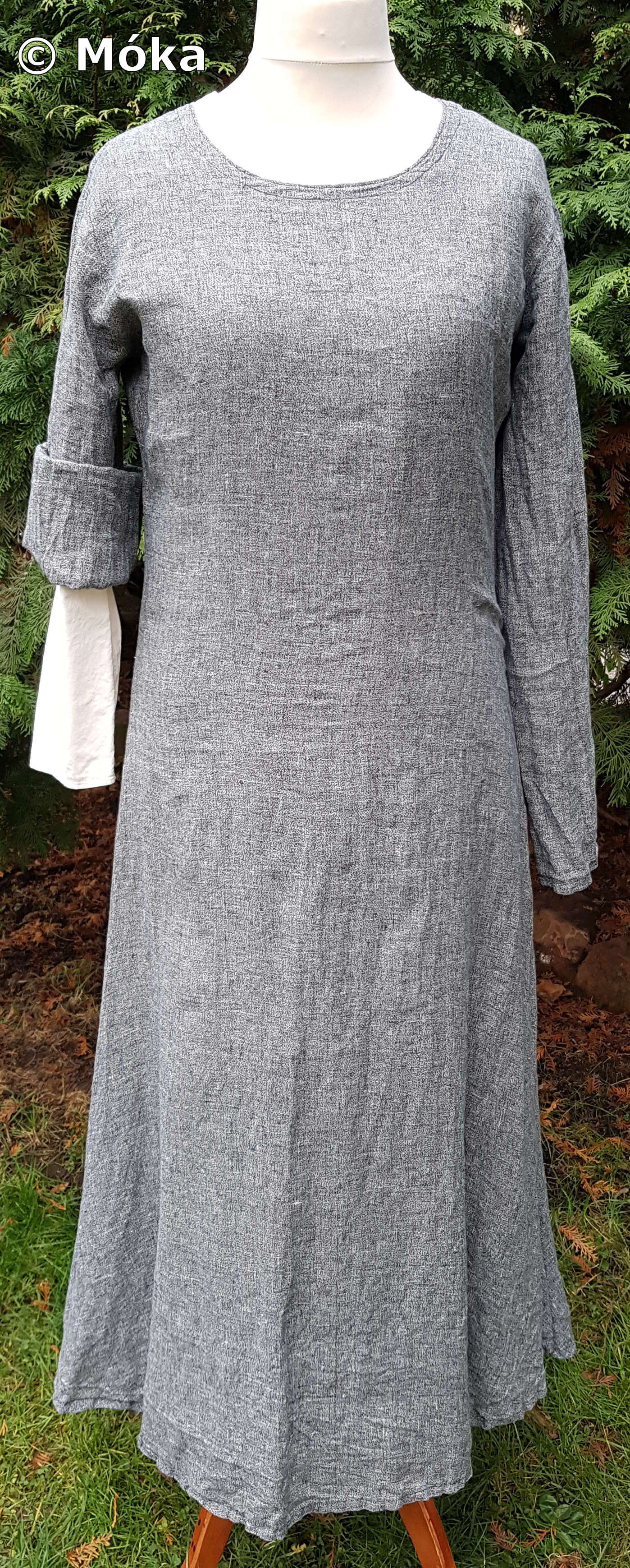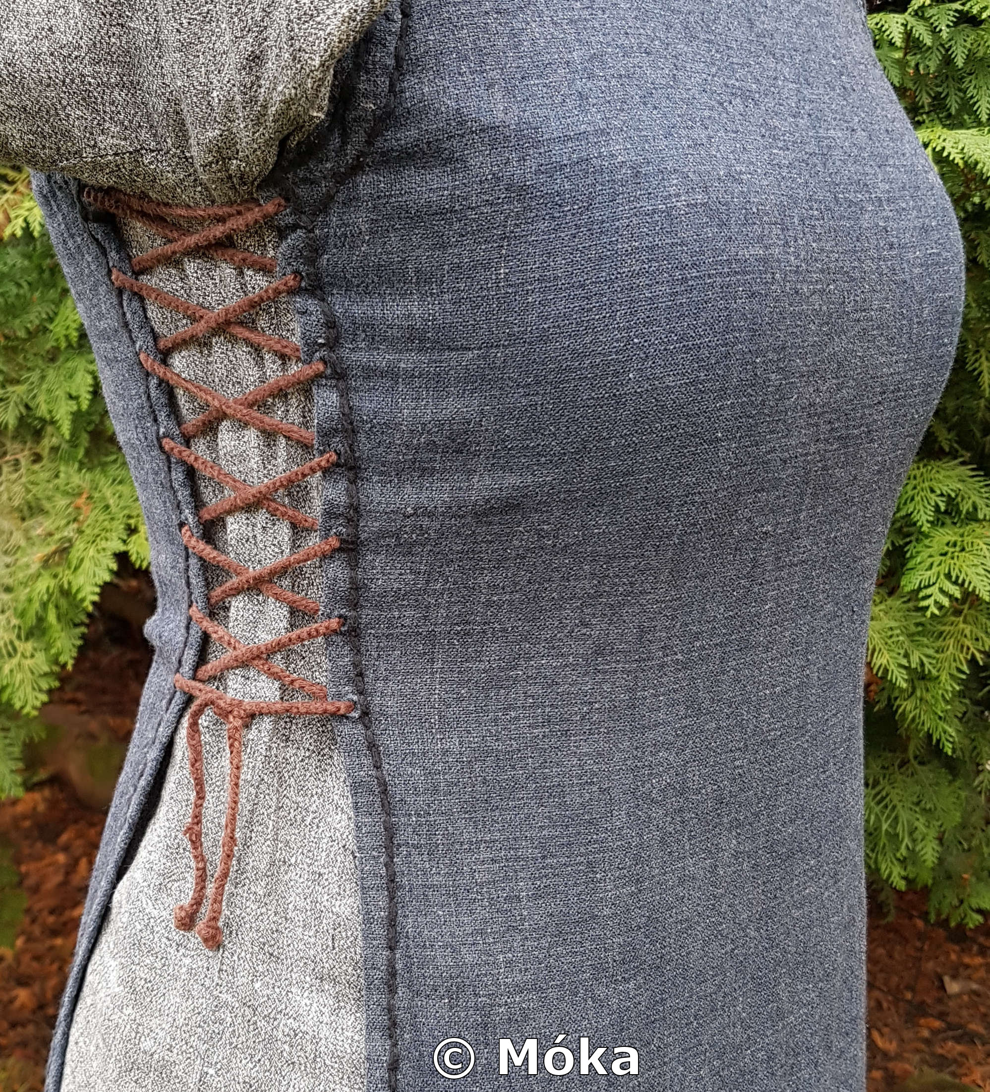 Das Schnittmuster ist jeweils ein einfaches Schlupfkleid. Das Untergewand wurde aus Bomull von Ikea genäht. Das Übergewand besteht aus dünnem Leinen. Beim Übergewand habe ich die Ärmel länger gefertigt. Diese werden umgeschlagen. Die Ärmelnäht verläuft hinten. Der blaue Überwurf besteht aus Leinen und wird an der Seite geschnürt. Die sichtbaren Nähten am Überwurf wurden von Hand mit dickem Baumwollfaden nachgenäht.